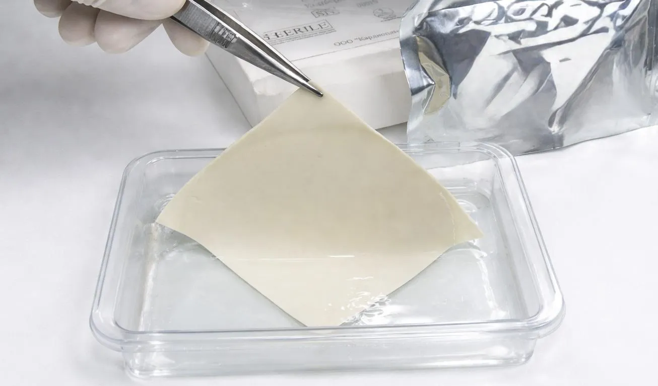 Биологическая заплата для реконструктивной сердечно-сосудистой хирургии, изготовленная из децеллюляризированного очищенного перикарда теленка и стабилизированная глутаровым альдегидом.